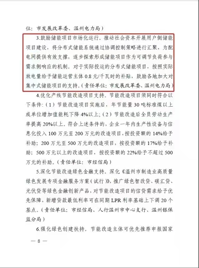 同時(shí),推動(dòng)社會(huì)資本開展用戶側(cè)儲(chǔ)能項(xiàng)目建設(shè),將分布式儲(chǔ)能系統(tǒng)通過協(xié)調(diào)控制策略進(jìn)行匯聚,為配電網(wǎng)提供有效支撐,逐步探索形成儲(chǔ)能項(xiàng)目作為可調(diào)節(jié)負(fù)荷參與需求側(cè)響應(yīng)的機(jī)制。對(duì)于實(shí)際投運(yùn)的分布式儲(chǔ)能項(xiàng)目,按照實(shí)際放電量給予儲(chǔ)能運(yùn)營主體0.8元/千瓦時(shí)的補(bǔ)貼,鼓勵(lì)各地加大對(duì)集中式儲(chǔ)能項(xiàng)目的支持。