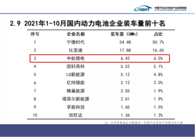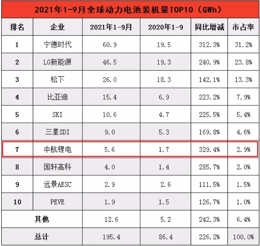 在10月底韓國市場(chǎng)研究機(jī)構(gòu)SNE Research公布的2021年1-9月全球動(dòng)力電池裝車量排行榜中,中航鋰電以5.6GWh的動(dòng)力電池裝車量,位居第七。