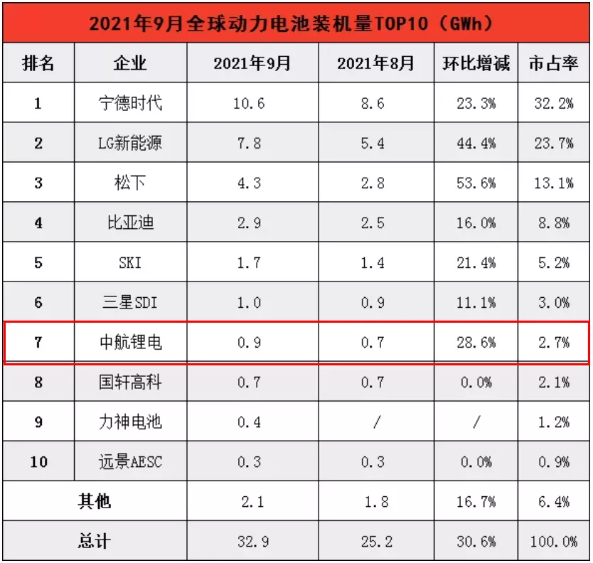 而從9月單月全球動(dòng)力電池裝車量排行榜來看,裝車量為0.9GWh、仍排名第七的中航鋰電,距離排名第六、裝車量為1GWh的韓國三星SDI僅差距0.1GWh。