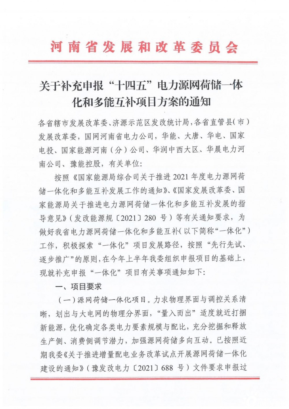 11月30日,河南省發(fā)改委發(fā)布了《關于補充申報“十四五”電力源網(wǎng)荷儲一體化和多能互補項目方案》的通知。按照“先行先試、逐步推廣”的原則,在今年上半年河南發(fā)改委組織申報項目的基礎上,再次補充申報“一體化”項目。