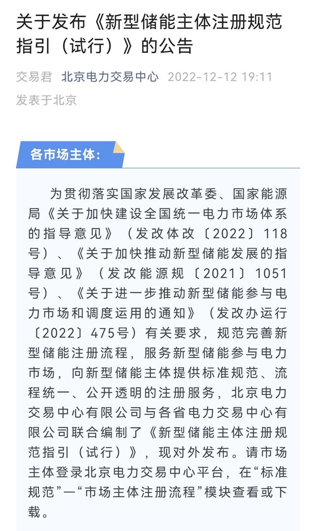 12日晚,北京市電力交易中心發(fā)布《新型儲能主體注冊規(guī)范指引(試行)》公告(下稱《指引》)。這是交易機構首次從實施層面統(tǒng)一明確將新型儲能作為獨立于發(fā)電企業(yè)、售電公司和用戶的注冊類型,并且規(guī)范了詳細的注冊程序與所需信息、資料。