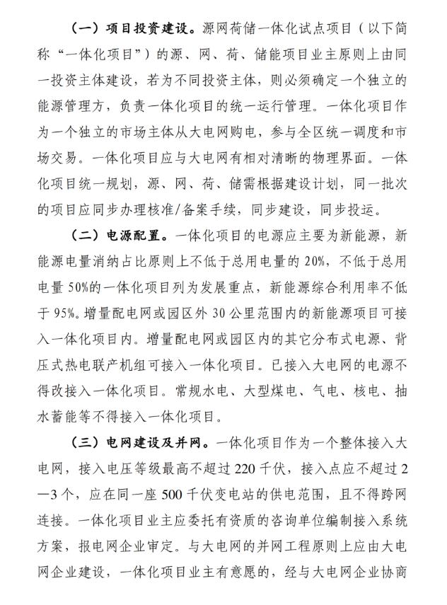 征求意見(jiàn)稿中關(guān)于園區(qū)(居民區(qū))級(jí)源網(wǎng)荷儲(chǔ)一體化試點(diǎn)要求中明確:一體化項(xiàng)目的電源配置為不低于總電量20%的新能源,其中不低于總用電量的50%的一體化項(xiàng)目列為重點(diǎn)發(fā)展,新能源綜合利用率不低于95%;儲(chǔ)能配置上要求不低于總裝機(jī)容量的15%、時(shí)長(zhǎng)2小時(shí),并能滿(mǎn)足削減一體化項(xiàng)目 5%高峰用電負(fù)荷的要求。