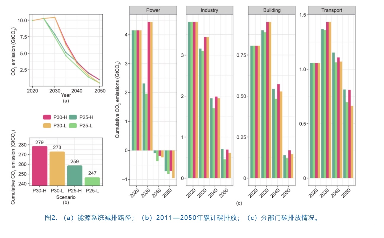 通過多情景比較發(fā)現(xiàn),提前達峰能夠給中國更多的時間來安排煤電廠的有序退役和可再生能源的平穩(wěn)部署。雖然提前達峰在短期內(nèi)可能會有更大的轉(zhuǎn)型壓力,但從長遠(yuǎn)來看,這是最具有成本效益的選擇。同時,提前達峰帶來的累計排放量減少,也將縮小21世紀(jì)下半葉對于負(fù)排放的大量需求。盡管4個情景2050年局地空氣污染物的排放差異不大,但是提前實現(xiàn)碳達峰將導(dǎo)致未來15年的空氣質(zhì)量得到明顯改善。2050年更低的排放值會增加整體的減排壓力,這將導(dǎo)致可再生能源和負(fù)排放技術(shù)的進一步擴張。需求部門在能源轉(zhuǎn)型中也將通過減少能源需求(但增加福利損失)、使用高成本技術(shù)(大規(guī)模使用氫能)等策略來應(yīng)對更為嚴(yán)格的排放約束。