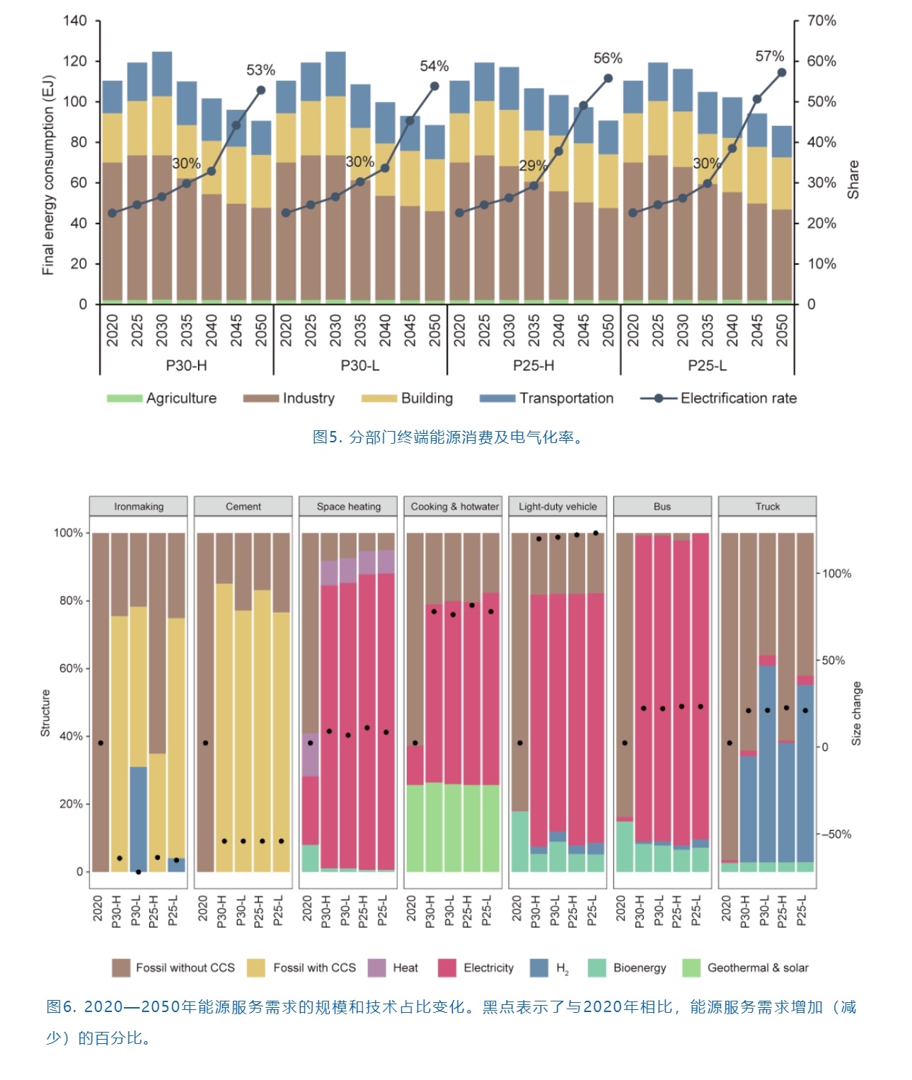 產(chǎn)業(yè)結(jié)構(gòu)調(diào)整、能源效率提高和清潔燃料替代是能源需求部門能耗和排放下降的三大支柱。據(jù)估計,第二產(chǎn)業(yè)在國民經(jīng)濟中的比重逐年下降,到2050年,這一比重將比2020年減少約9%,而第三產(chǎn)業(yè)比重將增加10%。如圖5所示,對于P30情景,中國的終端能源消費將在2030年以125 EJ達峰,而對于P25情景,達峰時間將提前到2025年左右,峰值水平也略低(119 EJ)。兩組情景都顯示,2050年中國終端能源消費將穩(wěn)定在90 EJ左右。未來的30年,電氣化率將持續(xù)上升,從目前的23%增加到2035年的30%,然后加速達到2050年的近60%。技術(shù)進步和終端能源的電氣化推動能源效率的快速提高。在圖6中,部分能源服務(wù)需求的規(guī)模以及技術(shù)占比變化以圖表的形式展示。