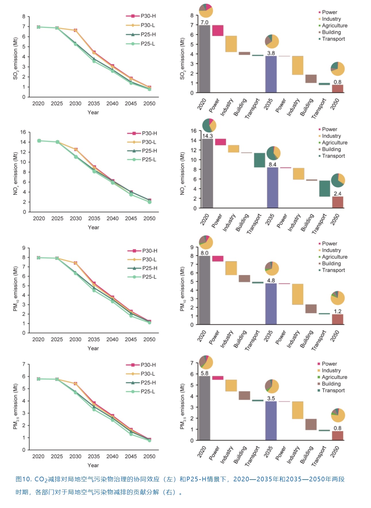 對比不同情景,在2025—2035年,上述4種局地污染物的排放在碳達峰時間不同的情景下會有明顯的不同。與P30情景相比,P25情景在2030年的SO2、NOx、PM10、PM2.5排放分別減少21%、12%、15%和14%。因此,盡管不同情景下2050年的排放趨于一致,盡早開始碳減排都將產(chǎn)生更多的近期收益。