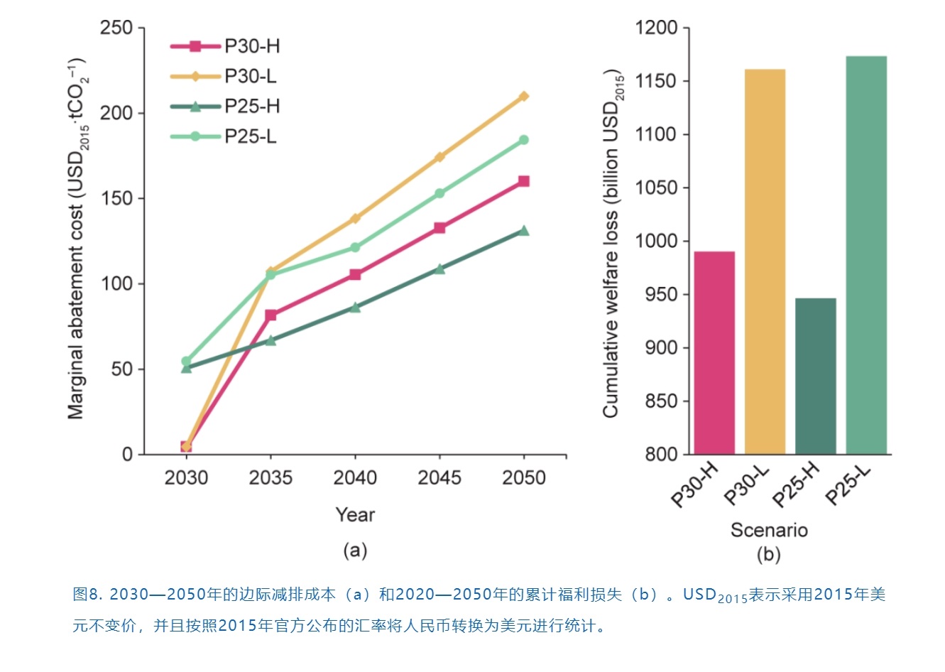 福利損失是另一個用于衡量轉(zhuǎn)型成本的指標(biāo)。MAC關(guān)注的是減排的難度,而福利損失衡量了減排對于消費者和生產(chǎn)者產(chǎn)生的影響。圖8(b)顯示,相較于僅實現(xiàn)國家自主貢獻目標(biāo)的基準(zhǔn)情景,在2020—2050年,碳中和情景的累計福利損失為0.947~1.173萬億美元。2050年碳預(yù)算較低的情景(P25-L和P30-L)的福利損失將比另外兩個情景高17%~24%,而達峰時間對于福利損失和能源服務(wù)需求的變化影響較小。