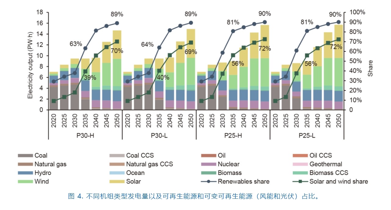 (2)中國需要在電力部門快速推廣可再生能源取代化石能源,同時由于可再生能源的高滲透率給電力系統(tǒng)的供需匹配帶來挑戰(zhàn),中國應(yīng)當(dāng)重視儲能設(shè)施的配套發(fā)展。