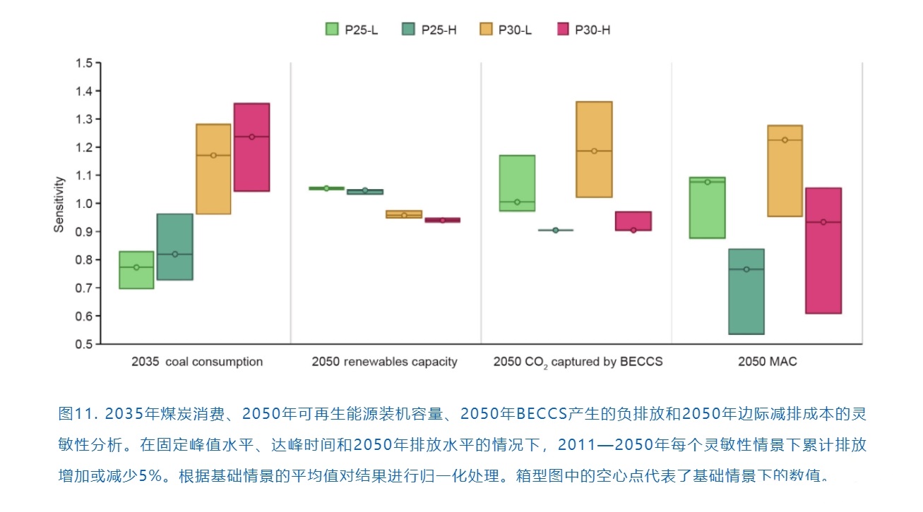 此外,在固定了達峰時間點、碳排放峰值和2050年排放量的情況下,對每個情景2011—2050年的累計排放做了上浮和下浮5%的靈敏性分析,進一步說明了碳達峰時間和碳中和時間的不確定性對于中國能源轉(zhuǎn)型的重大影響。