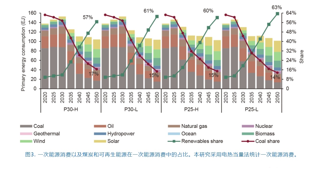 相比之下,可再生能源目前占一次能源消費的10%,同時增長緩慢,主要是為了滿足增量能源需求。未來,可再生能源將最有希望填補由煤炭消費下降造成的缺口,從而逐步取代化石燃料。據(jù)測算,在2035—2040年,可再生能源將超越化石燃料,成為中國最主要的能源。到2050年,中國一次能源消費中可再生能源比重將達到約60%。同樣,對于2050年碳預(yù)算較低或者開始減排較早的情景(P25-L、P25-H和P30-L),可再生能源的占比將更高。