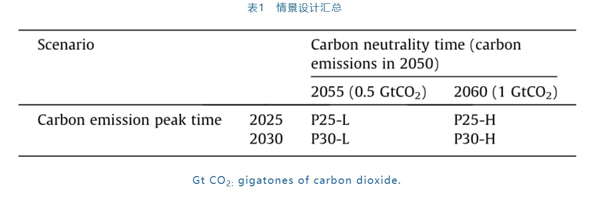 中國最新的長期氣候目標(biāo)是2030年前實現(xiàn)二氧化碳排放達峰,到2060年實現(xiàn)碳中和。為了探討碳達峰時間和碳中和時間差異對能源系統(tǒng)轉(zhuǎn)型的影響,本文設(shè)計了以下4個轉(zhuǎn)型情景(表1)。