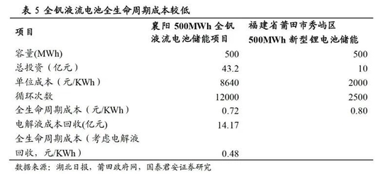 不過,釩電池儲能也有其劣勢,除了當下技術還不夠成熟之外,其初始投入也高于鋰電池等技術。國泰君安測算了襄陽500MWh全釩液流電池儲能項目與莆田500MWh新型鋰電池儲能項目的投資回收情況,在容量規(guī)模相同的情況下,前者的總投資為43.2億元,而后者為10億元。