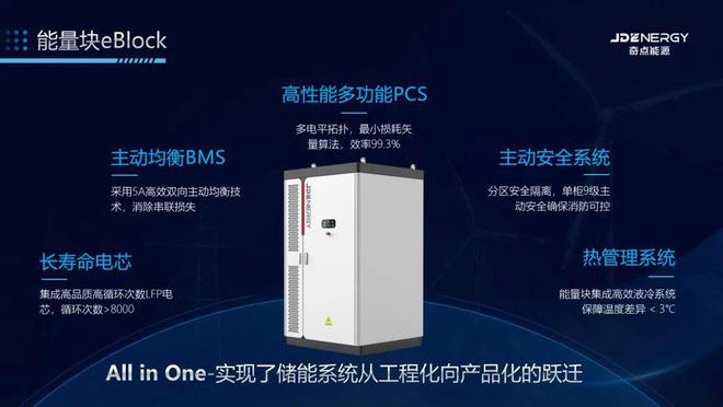基于“all in one”的產(chǎn)品化設(shè)計(jì)理念,奇點(diǎn)能源能量塊eBlock創(chuàng)新性地將長(zhǎng)壽命電芯、高效均衡BMS、高性能多功能PCS、主動(dòng)安全系統(tǒng)、高效熱管理系統(tǒng)融于單個(gè)戶(hù)外布署機(jī)柜,形成了一體化的智慧能量塊產(chǎn)品eBlock,為電化學(xué)儲(chǔ)能行業(yè)提供了一種全新的解決方案。其真正做到了把儲(chǔ)能工程轉(zhuǎn)化為標(biāo)準(zhǔn)化產(chǎn)品,定義了儲(chǔ)能系統(tǒng)集成新標(biāo)準(zhǔn)。