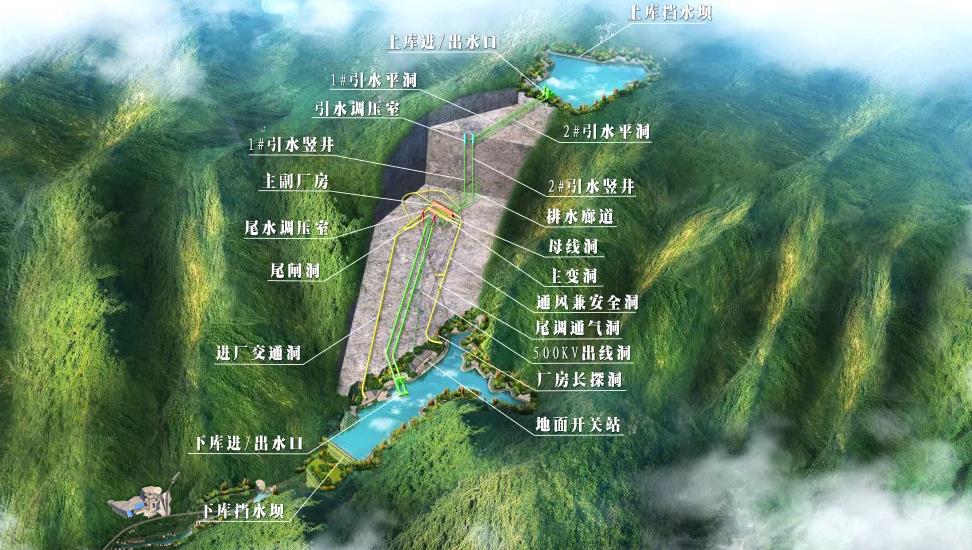 浙江松陽(yáng)抽水蓄能電站位于麗水市松陽(yáng)縣玉巖鎮(zhèn)、竹源鄉(xiāng)境內(nèi),是浙江省重大能源項(xiàng)目,已列入《抽水蓄能中長(zhǎng)期發(fā)展規(guī)劃(2021-2035年)》“十四五”重點(diǎn)實(shí)施項(xiàng)目,是松陽(yáng)歷史上投資最大項(xiàng)目,工程總投資約88.2億元,主要由上水庫(kù)樞紐、下水庫(kù)樞紐、輸水系統(tǒng)、地下廠房、地面開(kāi)關(guān)站、場(chǎng)內(nèi)道路及附屬設(shè)施等組成。電站為日調(diào)節(jié)純抽水蓄能電站,安裝4臺(tái)35萬(wàn)千瓦可逆式水泵水輪發(fā)電機(jī)組,總裝機(jī)容量為140萬(wàn)千瓦,年發(fā)電量為14億千瓦時(shí)。