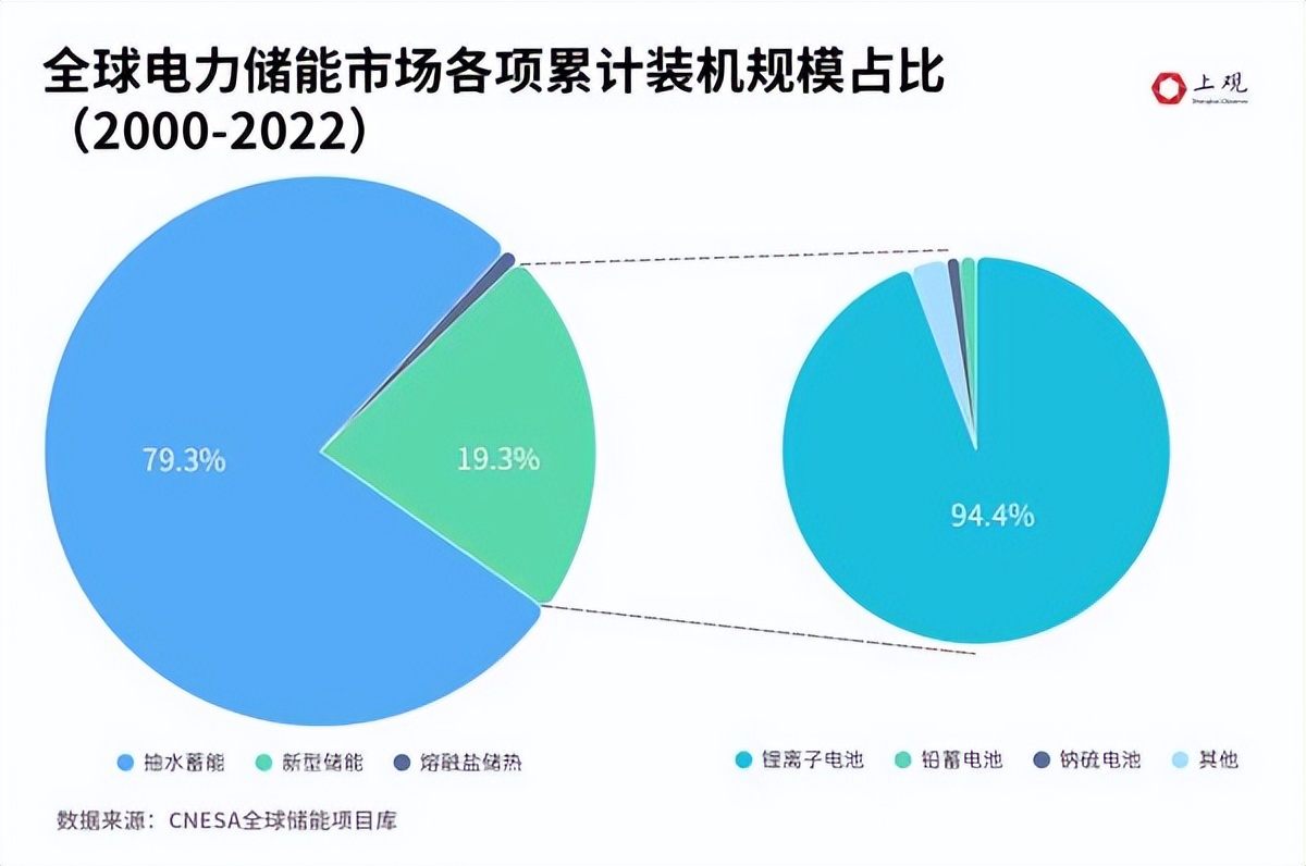傳統(tǒng)儲(chǔ)能產(chǎn)業(yè)大多利用水勢(shì)高低差進(jìn)行抽水蓄能,這也是目前全球儲(chǔ)能的主要方式,占比近八成。但抽水蓄能受地理資源約束明顯,一般只能建造在山區(qū)與丘陵地帶,且建造成本高、時(shí)間長(zhǎng)。隨著新能源產(chǎn)業(yè)的不斷發(fā)展,以鋰電池儲(chǔ)能為代表的新型儲(chǔ)能產(chǎn)品技術(shù)逐漸成熟、成本下降,迎來(lái)了大規(guī)模商業(yè)化的時(shí)機(jī)。