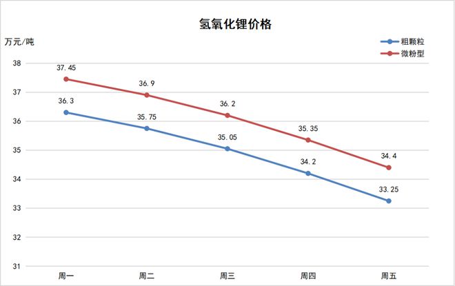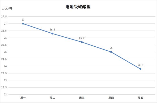 上周,3月27日-3月31日,鋰價(jià)繼續(xù)下跌。其中,電池級(jí)碳酸鋰價(jià)格下探至23.8萬(wàn)元/噸,氫氧化鋰價(jià)格低至33.25萬(wàn)元/噸,六氟磷酸鋰低至10.15萬(wàn)元/噸。