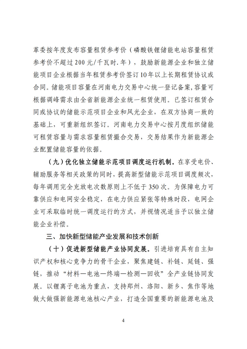 4月25日,河南發(fā)改委發(fā)布《加快我省新型儲能發(fā)展的實施意見(征求意見稿)》?!段募分赋?,加強新能源和新型儲能融合發(fā)展,發(fā)展目標為到2025年,力爭我省新能源配套的新型儲能裝機規(guī)模達到400萬千瓦以上。2021年及以后進入年度風光開發(fā)方案的新能源項目,嚴格按照開發(fā)方案規(guī)定的儲能配比建設儲能設施,儲能設施投運時間應不晚于新能源項目,如未按要求投運,電網(wǎng)不得調(diào)度和收購其電力電量。同一區(qū)域內(nèi),儲能配比高的新能源項目優(yōu)先調(diào)度,容量比例相同的情況下,儲能時長長的優(yōu)先調(diào)度。鼓勵已并網(wǎng)的存量新能源項目(戶用分布式、國家扶貧項目除外)配置新型儲能設施。重點發(fā)展大型獨立儲能電站。發(fā)揮大型儲能電站調(diào)節(jié)能力強、易調(diào)度的優(yōu)勢,重點建設容量不低于10萬千瓦時的獨立儲能電站。對新能源企業(yè)配建的、容量不低于10萬千瓦時、具有法人資格的新型儲能項目,按照自愿原則,在具備獨立計量、控制等技術(shù)條件,達到相關(guān)標準規(guī)范和電力市場運營機構(gòu)等有關(guān)方面要求,并接入調(diào)度自動化系統(tǒng)可被電網(wǎng)監(jiān)控和調(diào)度的基礎上,可轉(zhuǎn)為獨立儲能。
