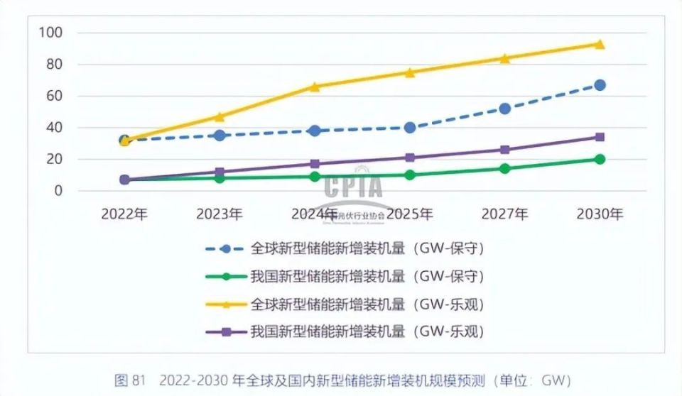 據(jù)中國光伏行業(yè)協(xié)會(huì)(CPIA)的統(tǒng)計(jì),2022年全球及國內(nèi)新型儲(chǔ)能新增裝機(jī)約為32GW、7GW,創(chuàng)歷史新高。隨著政策執(zhí)行、成本下降和技術(shù)改進(jìn),新型儲(chǔ)能將更能滿足發(fā)電側(cè)、電網(wǎng)側(cè)、用戶側(cè)的電力儲(chǔ)能需求。預(yù)計(jì)2025年,全球及我國新型儲(chǔ)能年度新增裝機(jī)或分別超過40GW、10GW,有望達(dá)到75GW、21GW。