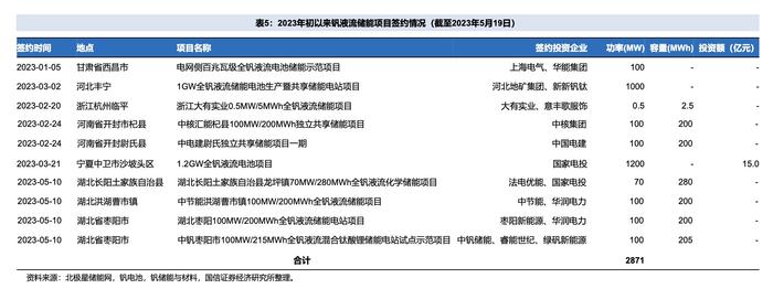 其中,釩電池儲能在政策驅(qū)動和技術(shù)不斷成熟的加持下,市場滲透率有望進(jìn)一步提升。據(jù)不完全統(tǒng)計,截至2023年5月第三周,國內(nèi)已簽約釩液流儲能項(xiàng)目10個,合計裝機(jī)功率達(dá)2.9GW,是2022年已投運(yùn)釩電池儲能裝機(jī)規(guī)模的近15倍。