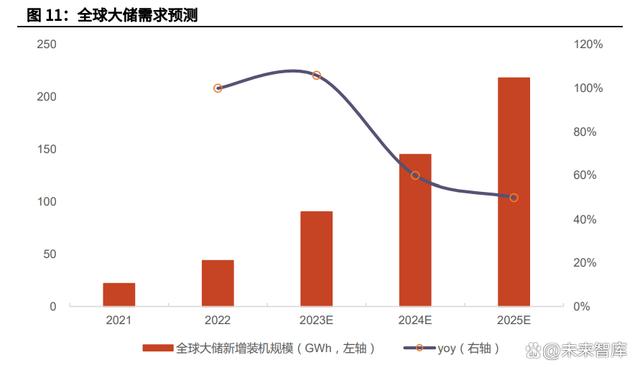 全球大儲市場高速發(fā)展,帶動儲能溫控需求大幅提升。隨著全球范圍上風(fēng)電、 光伏裝機(jī)的快速提升,中國、美國、歐洲、澳洲等各大市場對于大儲的需求均呈 現(xiàn)快速增 長態(tài)勢。 我們預(yù)計 2023-2025 年 中 國 大 儲 需 求 增速分別為 100%/60%/50%;美國大儲需求增速分別為 150%/50%/40%,其他地區(qū)大儲 需求增速分別為 80%/70%/60%,測算得 2023-2025 年全球大儲需求分別為 91/145/218GWh,2022-2025 年復(fù)合增長率達(dá) 71%。