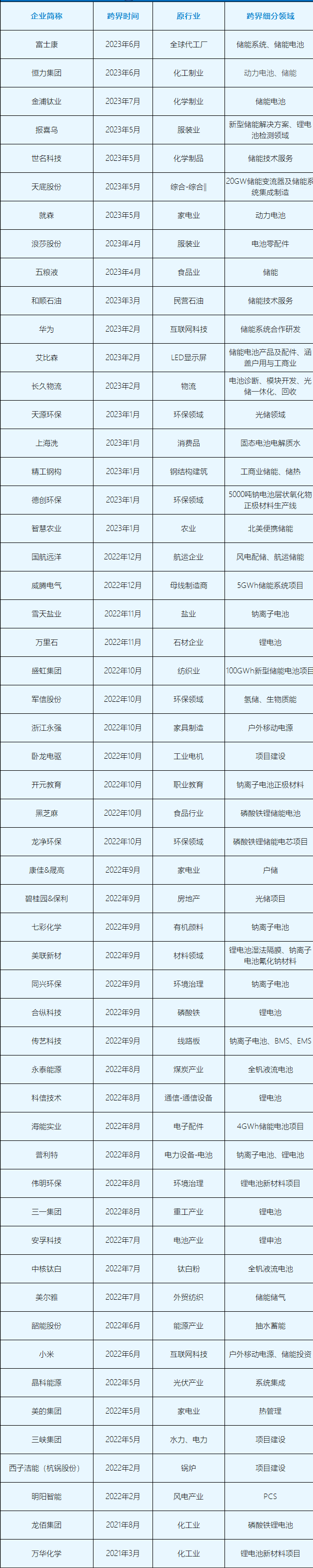 2022年以來,不少來自互聯網、化工、酒業(yè)、房地產、紡織、游戲、珠寶、家電、食品等領域的企業(yè)爭相加碼儲能。據小編統(tǒng)計,2022年至今,國內總計有54家知名上市企業(yè)先后公布儲能領域轉型或投資計劃。
