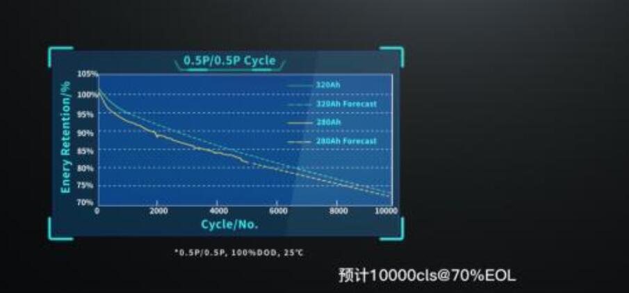 據(jù)官網(wǎng)介紹,這款300Ah電力儲能專用電池在與280Ah電池尺寸規(guī)格不變的情況下,可實現(xiàn)前三年“零”衰減(前1000次循環(huán),容量/能量衰減率≤2%),循環(huán)壽命可達(dá)12000次(可滿足15-20年應(yīng)用場景需求)。