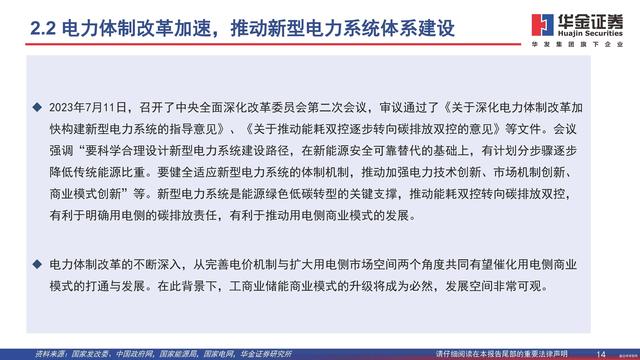2023年7月11日,召開了中央全面深化改革委員會第二次會議,審議通過了《關于深化電力體制改革加快構建新型電力系統(tǒng)的指導意見》、《關于推動能耗雙控逐步轉向碳排放雙控的意見》等文件。會議強調(diào)“要科學合理設計新型電力系統(tǒng)建設路徑,在新能源安全可靠替代的基礎上,有計劃分步驟逐步降低傳統(tǒng)能源比重。要健全適應新型電力系統(tǒng)的體制機制,推動加強電力技術創(chuàng)新、市場機制創(chuàng)新、商業(yè)模式創(chuàng)新”等。新型電力系統(tǒng)是能源綠色低碳轉型的關鍵支撐,推動能耗雙控轉向碳排放雙控,有利于明確用電側的碳排放責任,有利于推動用電側商業(yè)模式的發(fā)展。