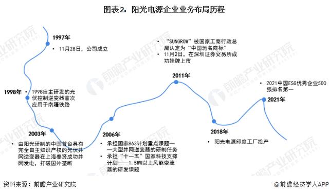 1997年11月28日,陽光電源成立;2003年,企業(yè)自主研發(fā)的中國首臺具有完全知識產(chǎn)權(quán)的光伏并網(wǎng)逆變器在上海奉賢成功并網(wǎng)發(fā)電,并打破國外壟斷;2011年11月,企業(yè)在深圳證券交易所成功掛牌上市;2018年,陽光電源的印度陽光電源印度工廠投產(chǎn)。