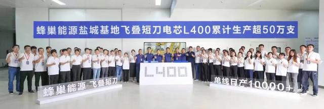 7月22日,蜂巢能源在鹽城基地慶祝飛疊短刀L400電芯累計(jì)生產(chǎn)超50萬支。