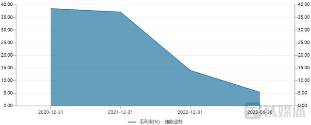 而細(xì)看公司儲(chǔ)能業(yè)務(wù)的毛利率,可以得知自2020年開始,該業(yè)務(wù)毛利率逐年下滑,其中2022年的下降幅度最為明顯。相關(guān)數(shù)據(jù)顯示,2020年—2022年及2023年上半年,儲(chǔ)能業(yè)務(wù)的毛利率分別為38.53%、37.17%、14.05%及5.41%。