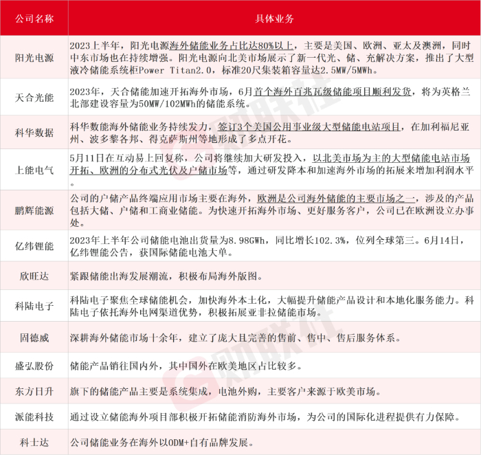 業(yè)內(nèi)人士表示,隨著2023年美國光伏裝機重新恢復增長及ITC補貼力度的加大,預計美國儲能需求將恢復翻倍以上的增速。對此,不少儲能企業(yè)紛紛加速“出海”,以全面進軍海外市場為主要目標。據(jù)財聯(lián)社不完全整理,在海外有布局儲能相關業(yè)務的上市公司主要為陽光電源、天合光能、科華數(shù)據(jù)、上能電氣、鵬輝能源、億緯鋰能、欣旺達、科陸電子、固德威、盛弘股份、東方日升、派能科技、科士達等,具體情況如下: