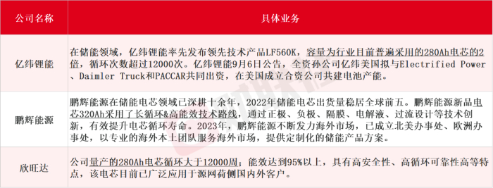 據(jù)財聯(lián)社不完全整理,出口海外的儲能電芯A股上市公司主要為億緯鋰能、鵬輝能源、欣旺達等,還包括自研電芯配套戶儲終端產(chǎn)品的企業(yè),如比亞迪、派能科技等。而另一邊,儲能電池出海的風吹向了大儲,截至目前,已經(jīng)有包括瑞浦蘭鈞、遠景動力、海辰儲能、億緯鋰能等多家企業(yè)獲海外儲能集成商大單,單筆最大訂單已達10GWh。A股上市公司具體業(yè)務如下: