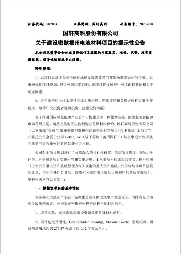 10月25日晚間,中國(guó)鋰電巨頭國(guó)軒高科發(fā)布公告,擬在美國(guó)密歇根州建設(shè)電池正負(fù)極材料項(xiàng)目,計(jì)劃總投資額達(dá)23.64億美元(約合人民幣173億元),并委托公司全資子公司美國(guó)國(guó)軒與密歇根州政府及其他第三方合作伙伴簽署相關(guān)協(xié)議。截至發(fā)稿,國(guó)軒高科暫報(bào)21.62元,跌1.32%,總市值383.9億元。