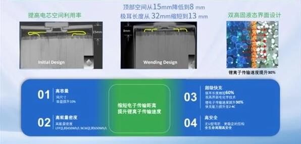 從電池技術(shù)角度來看,瑞浦蘭鈞 320Ah 問頂儲能電池采用首創(chuàng)的問頂技術(shù),通過電池內(nèi)部結(jié)構(gòu)創(chuàng)新設(shè)計、雙高電極、電化學(xué)體系創(chuàng)新等,讓電池的頂部空間從 15mm 降低到 8mm,空間利用率有效提升 7% 以上,極耳長度從 32mm 縮短到 13mm,以及應(yīng)用了雙高固液態(tài)界面設(shè)計,使得鋰離子傳輸速度提升 30%。另外,其體積能量密度也隨之提高 10%,原材料及部件成本節(jié)省 5%,無 U 型彎折有著更穩(wěn)定的結(jié)構(gòu),全方位實現(xiàn)高容量、高安全、高效率、長壽命等性能升級。