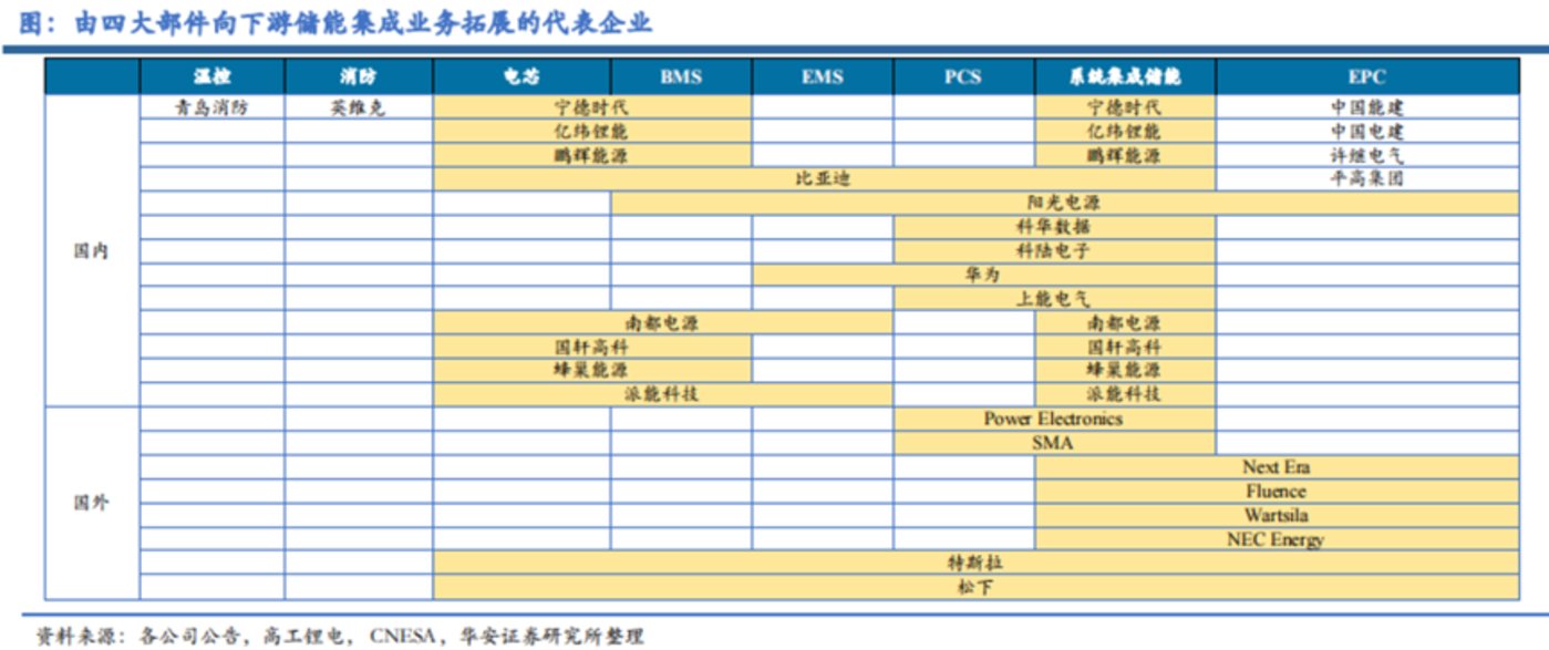 比如寧德時(shí)代、億緯鋰能等公司從電池進(jìn)入系統(tǒng)集成;陽光電源、科陸電子、上能電氣從PCS進(jìn)入系統(tǒng)集成等。也有比亞迪這樣電芯、PCS、BMS、EMS、系統(tǒng)集成全產(chǎn)業(yè)鏈布局的一體化。