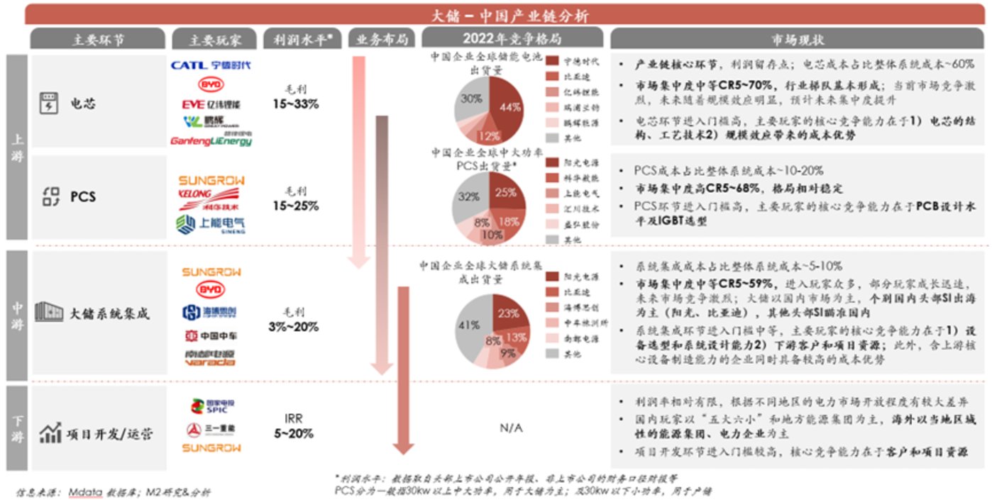 覓途咨詢的調(diào)研顯示,在大儲(chǔ)系統(tǒng)的價(jià)值鏈中,上游設(shè)備制造環(huán)節(jié)是核心的利潤留存點(diǎn),技術(shù)壁壘高,新玩家難以進(jìn)入市場;中游系統(tǒng)集成環(huán)節(jié)玩家眾多,市場競爭激烈,核心競爭點(diǎn)在客戶和項(xiàng)目資源開發(fā)能力,僅有個(gè)別頭部玩家以出海業(yè)務(wù)為主;未來伴隨運(yùn)營市場成熟IRR提升,更多企業(yè)將向下滲透。