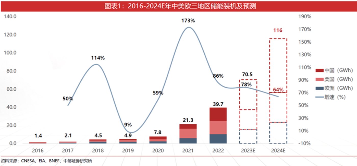 實(shí)際上,電化學(xué)儲(chǔ)能行業(yè)依然增長不錯(cuò)。國內(nèi)的新增裝機(jī)量翻倍,美國、歐洲整體增速也在50%左右。這三個(gè)地區(qū)占全球比例達(dá)到86%,基本代表了全球行業(yè)狀況。而這個(gè)增速,已經(jīng)讓許多行業(yè)流口水了。