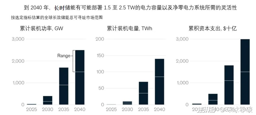 2021年,全球知名咨詢公司麥肯錫和長期儲能協(xié)會(LDES)發(fā)布的一份報告表示,到2040年,LDES 有可能在全球部署 1.5 至 2.5 TW)(太瓦)的裝機容量,是當前部署的總儲能容量的8到15倍。對應的儲能容量是 85-140TWh)(太瓦時 )。