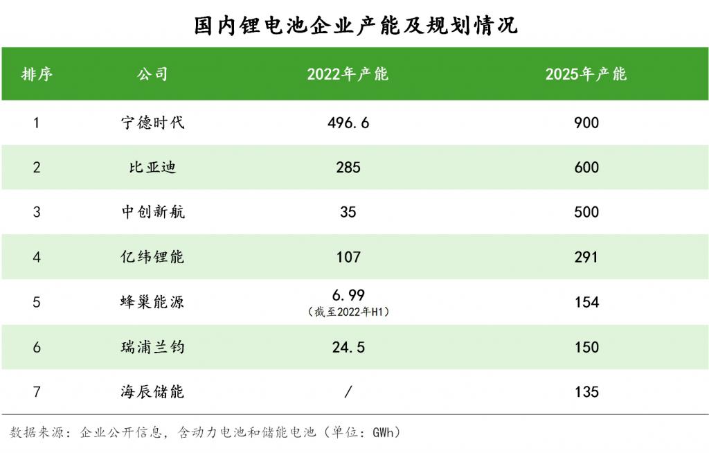 此外,寧德時(shí)代、比亞迪、中創(chuàng)新航、億緯鋰能、蜂巢能源等玩家也制定了很高的產(chǎn)能目標(biāo),他們 2025 年的預(yù)計(jì)鋰電池產(chǎn)能分別為 900GWh、600GWh、500GWh、291GWh、154GWh。