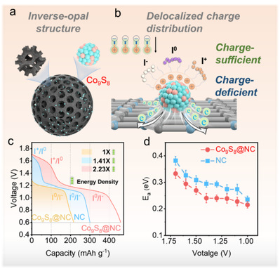 鑒于此,胡海波教授和合作者,設(shè)計(jì)開(kāi)發(fā)了一種具有反蛋白石結(jié)構(gòu)的Co9S8@NC復(fù)合催化劑,以其缺電荷態(tài)的特點(diǎn)調(diào)控對(duì)碘物種的吸附作用,從而提高I+/I0/I-兩電子連級(jí)反應(yīng)動(dòng)力學(xué)。同時(shí),其高比表面積,減輕了與碘氧化還原過(guò)程相關(guān)的能量壁壘。這些結(jié)構(gòu)特征又為調(diào)節(jié)碘氧化還原過(guò)程的動(dòng)力學(xué)提供了有效手段。該工作為開(kāi)發(fā)基于多重電子轉(zhuǎn)移反應(yīng)的、兼具高能量密度和高功率密度碘電極化學(xué)提供了模型系統(tǒng)和理論框架(Advanced Materials, 2024, DOI: 10.1002/adma.202312246)。