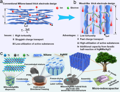圖3.a) 具有密堆積結(jié)構(gòu)的傳統(tǒng)MXene厚電極設(shè)計(jì)與b)具有類(lèi)木質(zhì)微結(jié)構(gòu)的MXene/AgNWs混合厚電極設(shè)計(jì)在結(jié)構(gòu)和功能上的優(yōu)勢(shì)比較;c) 類(lèi)木MXene/AgNWs混合厚電極的制備過(guò)程和微型氧化還原電容器的組裝示意圖。