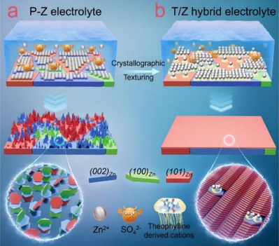 圖2. 在a)純ZnSO4電解質(zhì)和b)含有微量茶堿添加劑的優(yōu)化混合電解質(zhì)中,鋅陽(yáng)極表面的鍍鋅行為示意圖.
