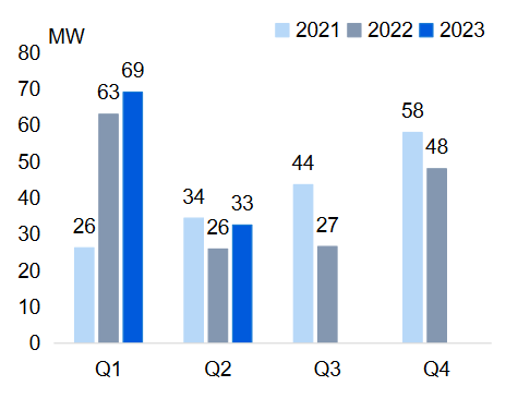 美國工商儲現(xiàn)狀:根據(jù)Wood Mackenzie數(shù)據(jù),2023H1,美國新增工商儲裝機(jī)累計達(dá)101.6MW/310.3MWh,同比+14.3%/+53.7%。據(jù)該機(jī)構(gòu)預(yù)測,后續(xù)供應(yīng)鏈的挑戰(zhàn)和各州相關(guān)政策的缺乏會對工商儲安裝造成沖擊。