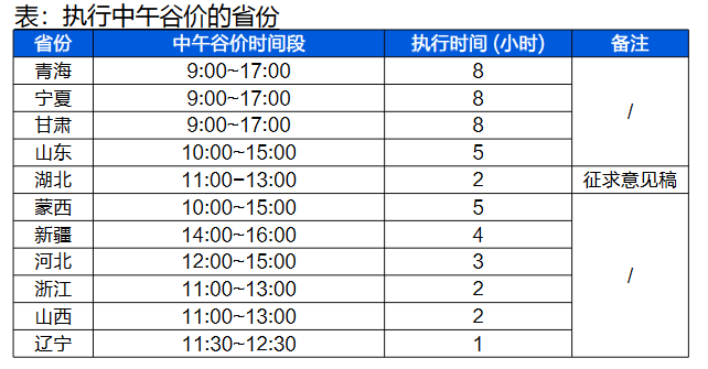 此外,當(dāng)前峰谷價差套利是工商業(yè)儲能的主要盈利渠道,儲能系統(tǒng)價格下行有望進(jìn)一步提升經(jīng)濟(jì)性。隨著光伏發(fā)電供大于求,中午執(zhí)行谷段電價或成為趨勢。截至目前,全國已有11個省份部分月份中午出現(xiàn)谷電,2充2放從原來的1次峰/谷+1次峰/平轉(zhuǎn)變?yōu)?次峰/谷,儲能收益進(jìn)一步提升。