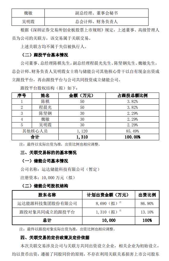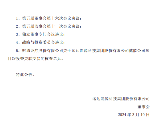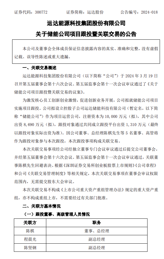 3月19日,運(yùn)達(dá)股份發(fā)布《關(guān)于儲(chǔ)能公司項(xiàng)目跟投暨關(guān)聯(lián)交易的公告》。