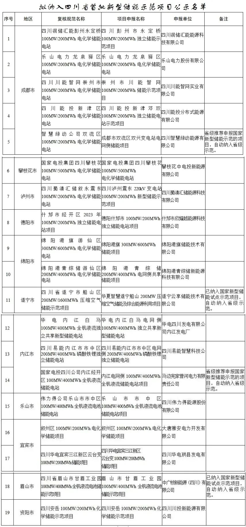 3月24日,四川發(fā)改委公布了《擬納入四川省首批新型儲能示范項目公示名單》,共有19個項目,總規(guī)模2.4GW/7.1GWh。