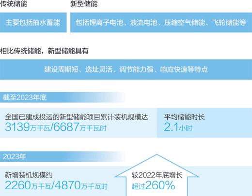 今年的《政府工作報(bào)告》提出,發(fā)展新型儲(chǔ)能。新型儲(chǔ)能是實(shí)現(xiàn)碳達(dá)峰碳中和目標(biāo)的重要支撐,包括鋰離子電池、液流電池、壓縮空氣儲(chǔ)能、飛輪儲(chǔ)能等,具有建設(shè)周期短、選址靈活、調(diào)節(jié)能力強(qiáng)、響應(yīng)快速等特點(diǎn)。國(guó)家能源局?jǐn)?shù)據(jù)顯示,截至2023年底,全國(guó)已經(jīng)建成投運(yùn)新型儲(chǔ)能項(xiàng)目累計(jì)裝機(jī)規(guī)模達(dá)3139萬(wàn)千瓦/6687萬(wàn)千瓦時(shí),平均儲(chǔ)能時(shí)長(zhǎng)2.1小時(shí);2023年新增裝機(jī)規(guī)模約2260萬(wàn)千瓦/4870萬(wàn)千瓦時(shí),較2022年底增長(zhǎng)超過(guò)260%。