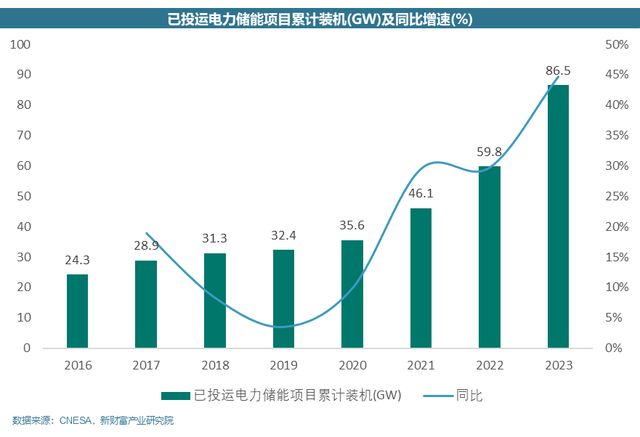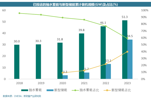 根據中國能源研究會儲能專委會及中關村儲能產業(yè)技術聯(lián)盟(CNESA)提供的數(shù)據,到2023年底,抽水蓄能的累計裝機容量為51.3吉瓦,市場份額從2022年的77.1%降至59.4%。相比之下,新型儲能裝機量達到34.5吉瓦,容量為74.5吉瓦時,同比增長達到163.36%,市場份額也從2022年的21.9%上升到39.9%。