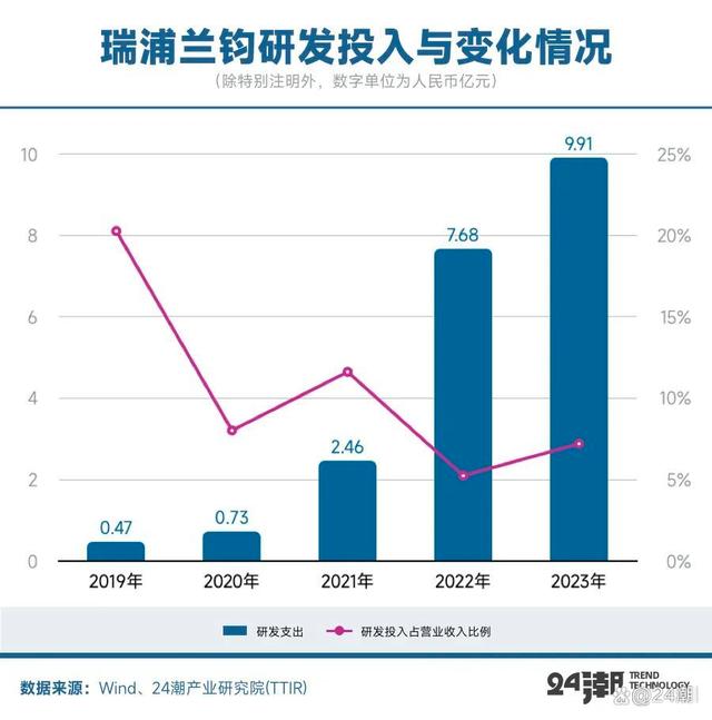 而瑞浦蘭鈞的技術(shù)突破與持續(xù)且強力的研發(fā)投入有很大關(guān)系。24潮產(chǎn)業(yè)研究院(TTIR)分析發(fā)現(xiàn),近幾年瑞浦蘭鈞研發(fā)投入一直保持增長趨勢,2023年其研發(fā)支出為9.91億元,同比增長了29.04%,研發(fā)投入占營業(yè)收入比例由2022年的5.24%提升至2023年的7.20%。