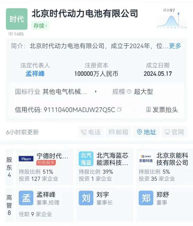 《中國經(jīng)營報(bào)》記者在天眼查上看到,5月17日,北京時(shí)代動(dòng)力電池有限公司成立,法定代表人為孟祥峰,注冊(cè)資本10億元人民幣,是一家以從事電氣機(jī)械和器材制造業(yè)為主的企業(yè)。股東信息顯示,該公司由寧德時(shí)代、小米汽車科技有限公司、北汽海藍(lán)芯能源科技(北京)有限公司、北京京能科技有限公司共同持股。