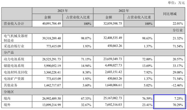 從銷售區(qū)域來看,海外市場(chǎng)已經(jīng)成為推動(dòng)寧德時(shí)代營(yíng)收增長(zhǎng)的關(guān)鍵。據(jù)公司年報(bào)數(shù)據(jù)顯示,2023年全年,寧德時(shí)代境外市場(chǎng)實(shí)現(xiàn)銷售收入1309.92億元,同比增長(zhǎng)70.29%,收入占比為32.67%,同比提升了9.16個(gè)百分點(diǎn),毛利率為25.19%。對(duì)比看,公司境內(nèi)市場(chǎng)銷售收入為2699.25億元,同比增長(zhǎng)7.25%,銷售毛利率為21.8%。